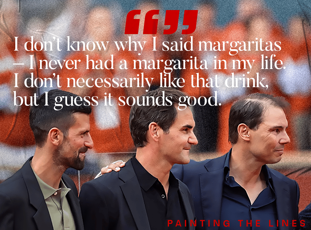 Djokovic couldn’t help but smile when reminded of his cheeky line after a match about not being quite ready to “sip margaritas on the beach” with Federer and Nadal.